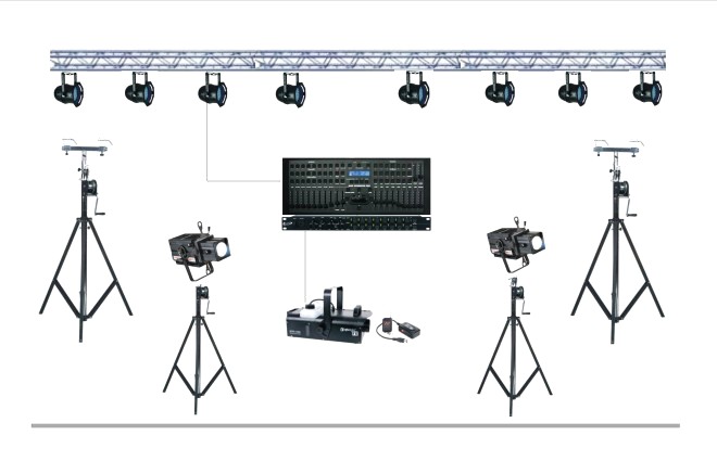 * Základní osvětlení kapely.8xLED PAR64 50W ovládané DMX pultem, zadní rampa 6m , 2 x stativ do cca 4m,